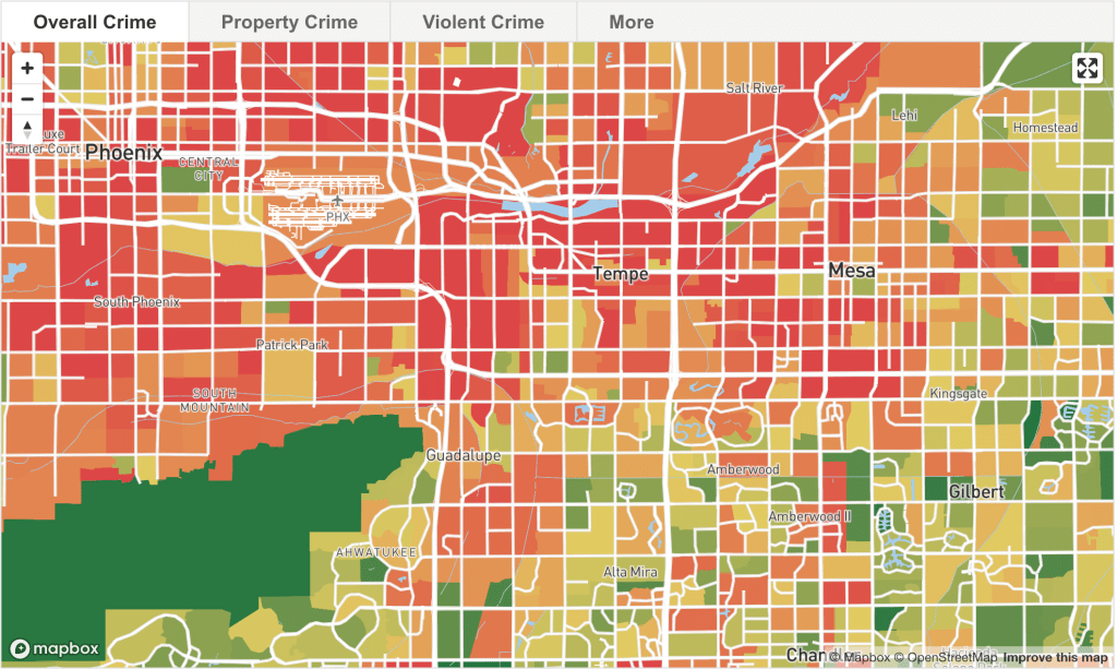 https://neighborhoodscout.com This source reports 48 crimes per 1,000 residents for all of Tempe, still higher than the national average. It is, unfortunately, behind a paywall.